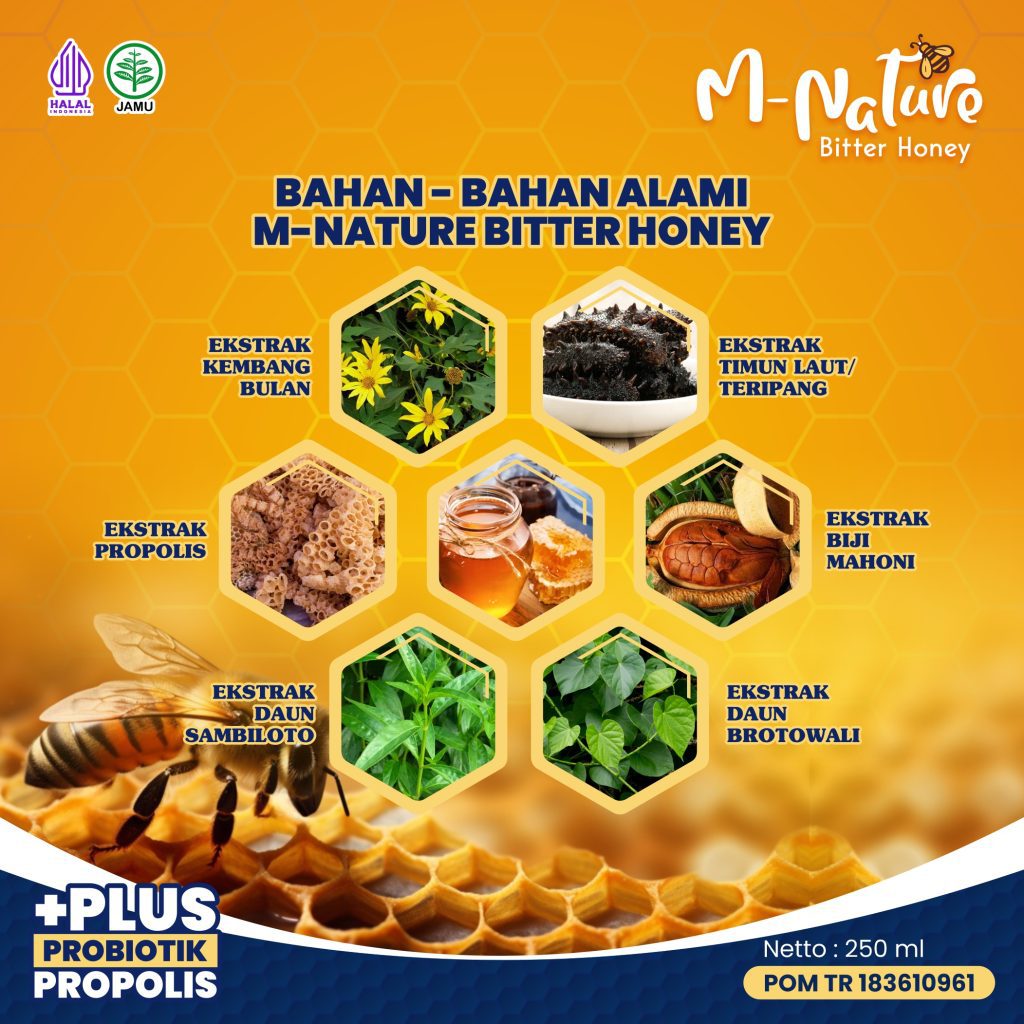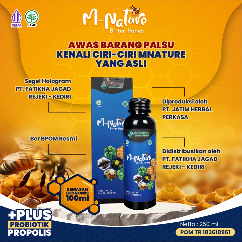 M-Nature adalah brand herbal kesehatan yang berfokus menghadirkan madu hitam pahit premium berbahan dasar madu murni pilihan dan ekstraksi herbal pahit Nusantara. Dengan menggabungkan khasiat alami teripang laut, brotowali, sambiloto, mahoni, propolis serta probiotik formulasi Jepang, M-Nature diciptakan sebagai solusi herbal lengkap untuk membantu banyak keluhan kesehatan masyarakat Indonesia.